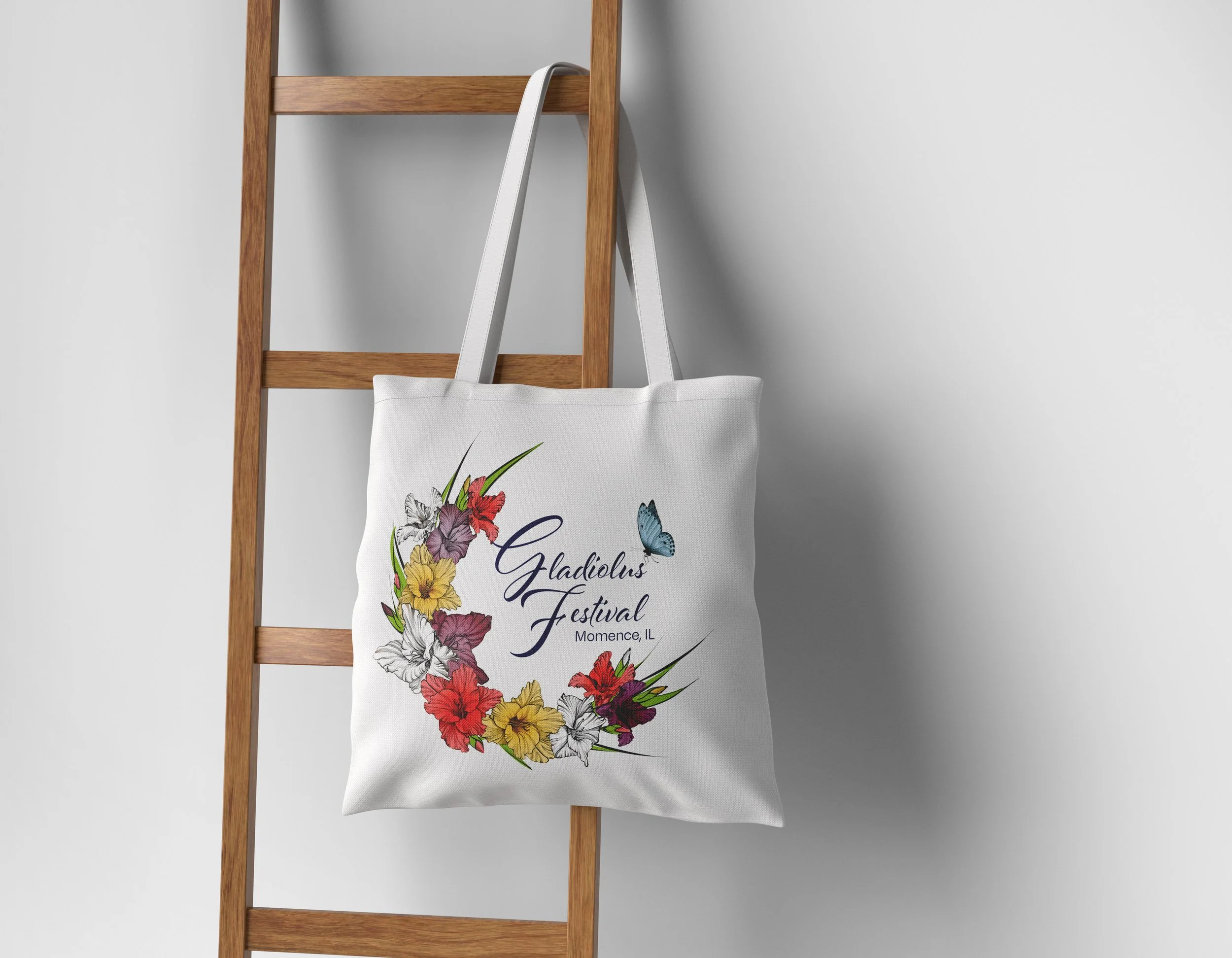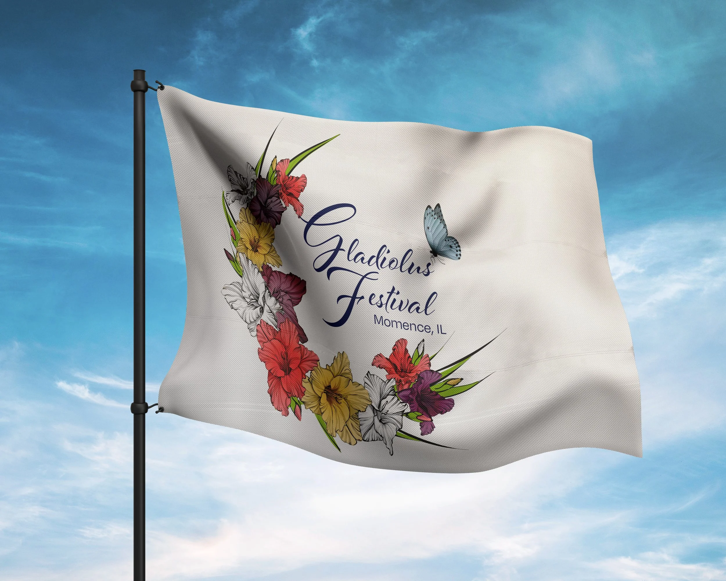 The wreath style is the one that was chosen. I created this graphic using brightly colored gladiolus blooms in a wreath shape, with the name of the festival front and center. When I finished, something was missing, though I wasn't sure what. I slept on it and had the idea of adding a butterfly perched on the text 🦋. I think that added the right amount of life and balance to the piece, don’t you?