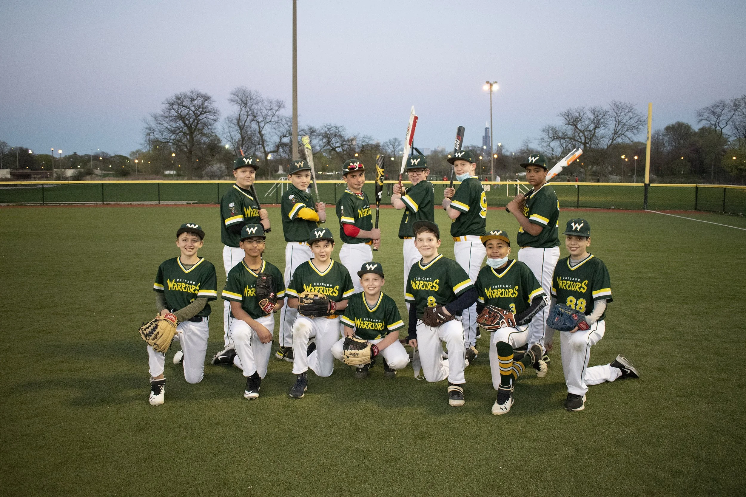 I photographed the team prior to the start of their season (note still clean white pants 😉). Did quite a bit of editing in photoshop (scroll 👇 to see the original photo 😆), dropped in a new background, added their names and the Chicago Warriors Logo that I recreated: more on that here >