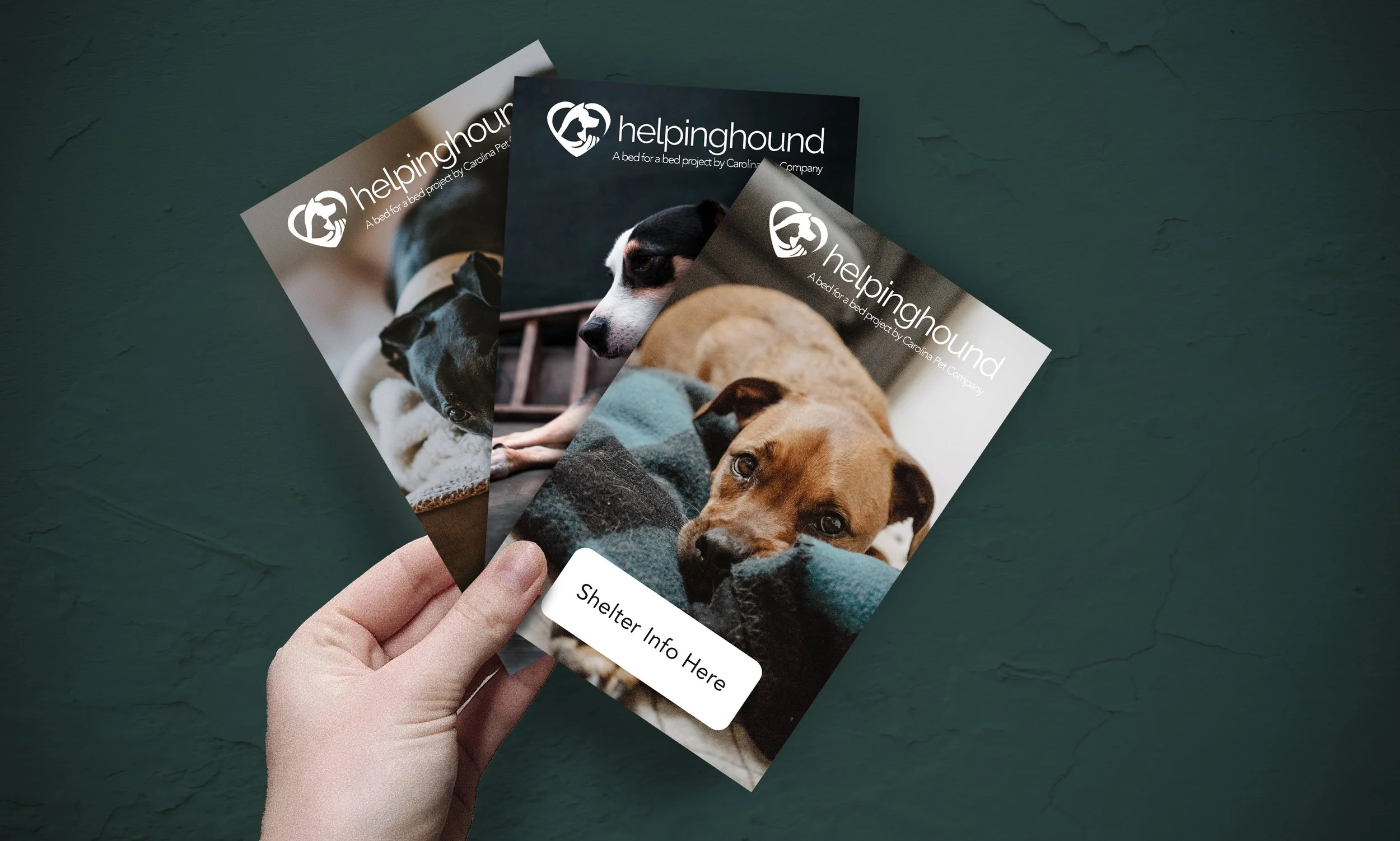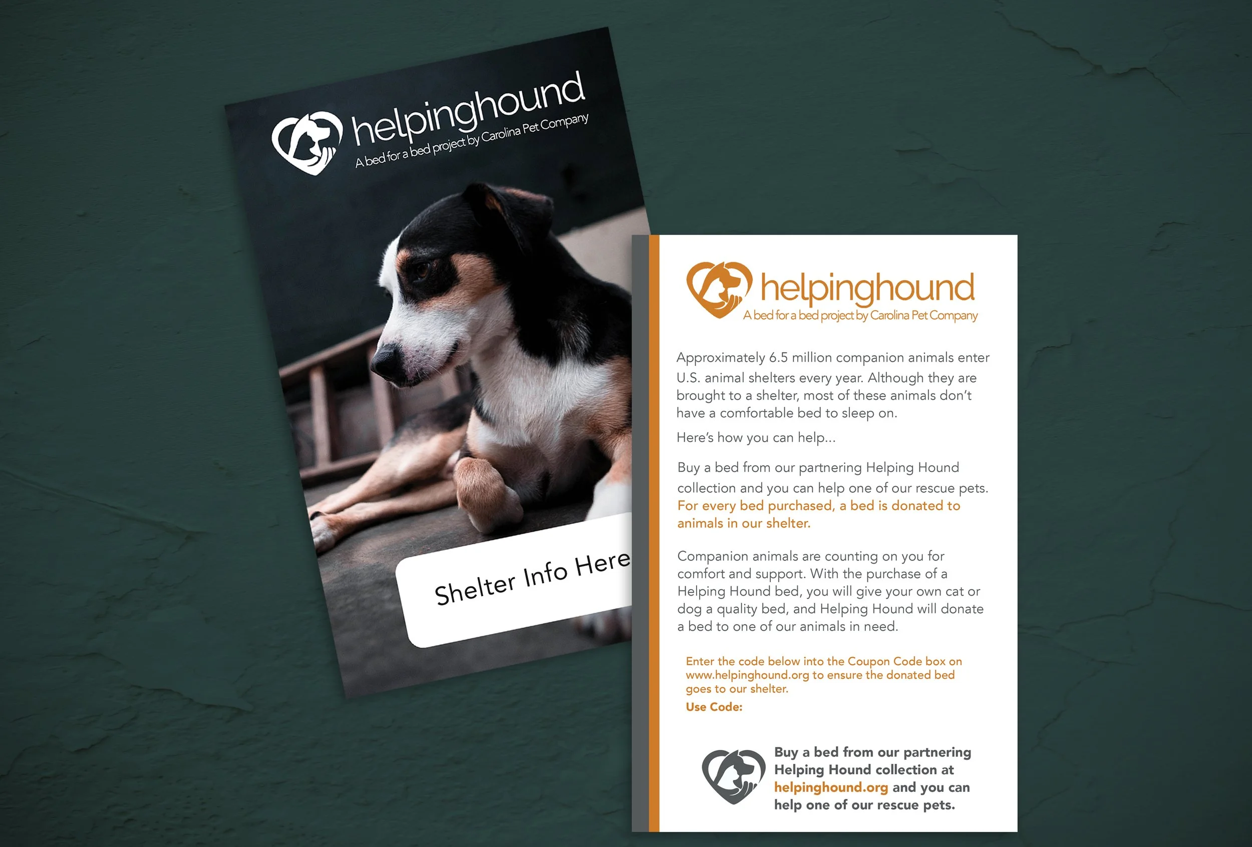 This postcard was designed for the participating shelters to have at their location to hand out to new pet parents and visitors. The shelter would place a sticker with their name and address in the space on the front of the card and on the back was a place for them to write the code for their shelter for the customer to use on the Helping Hound website.